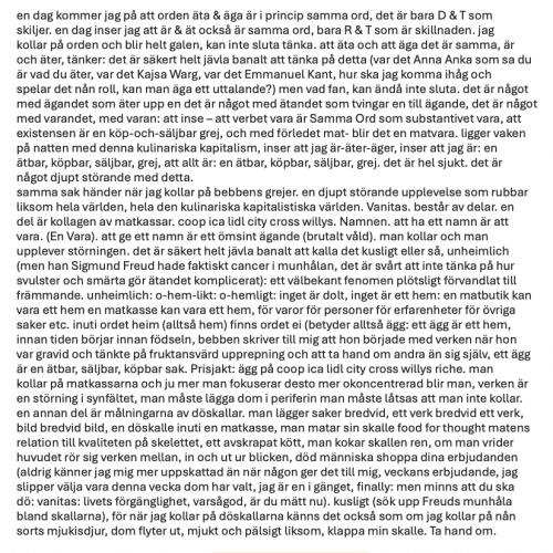 I utställningen Vanitas visas en serie målningar utförda 2021-2023 förställande en ensam dödskalle. Skallarna visas tillsammans med ett antal nya kollage av de stora matkedjornas