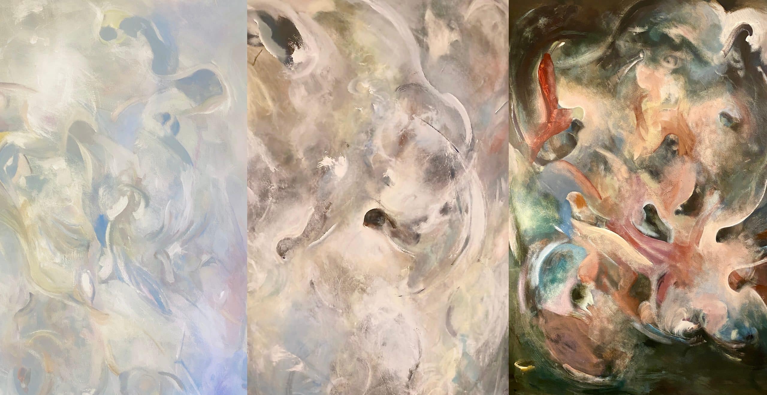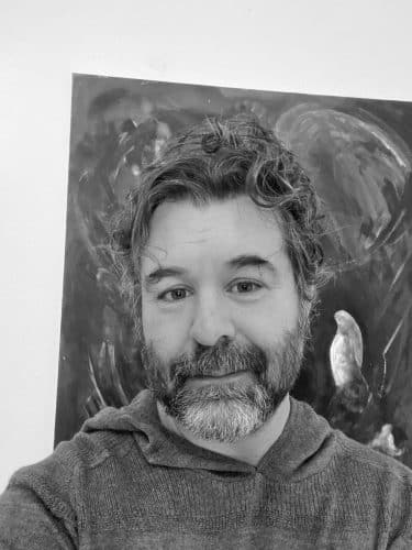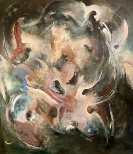 Jag började måla. Sen gjorde jag filmer. Ordlösa filmer om sinnestillstånd och motsättningar. Ibland filmer helt utan ljudspår. Där andningen i biosalongen blev ett ljudspår. Jag har skiftat emellan att måla och göra film av samma tema, samma bildvärld. För mig fungerar måleriet som ett psykologiskt reningsarbete, ett sätt att närma mig mitt undermedvetna. Processen är ofta våldsam och fysisk: jag målar, dekonstruerar, täcker över och ändrar i en cykel av frustration och fokus. Det är en kamp där jag fäktas med materialet och mig själv tills jag landar på andra sidan. Mitt mål är aldrig att nå det estetiskt ”vackra” i traditionell mening; jag söker istället det som känns rent, okränkbart och sant. Mitt. Genom att utgå ifrån en oformlig massa, en dunkel värld, kan figurer och idéer bli tydligare, nästan genom intuition, utan att titta. Det är ett intuitivt arbete där jag mejslar fram motivet ur färglagren, som om bilden redan fanns där inne i stenen och bara väntade på att bli befriad. De senaste sju åren har jag spelat i ett band. Trummor bas och gitarr. Vi jobbade med stämningar och mörker och sorg. Jag har börjat lära mig att lyssna. Och följa försiktigt. Ha tålamod och vänta. Ofta spelar jag för högt. För mycket. Men ibland när det stämmer, har folk kommit in i replokalen och lyssnat, dansat och applåderat. Jag har lärt mig väldigt mycket om skapande av min vän och tagit in den processen i måleriet. Inte bara av att spela. Utan av att bråka och skratta och vara gränslös. Parallellt med konsten och musiken har fått möjlighet att gå i en långvarig terapi. Det har varit ett arbete i att våga stanna kvar i svåra känslor, att se mig själv och att lita på en annan människa. Idag ser jag dessa olika delar – konsten, musiken och samtalet – som grenar på samma träd. Det är en sammanhängande process av utforskande som jag aldrig kommer att bli helt färdig med. Det är ett livslångt arbete som fortsätter så länge jag lever, med målet att sanningen i uttrycket ska bli allt tydligare, i alla fall för mig själv.