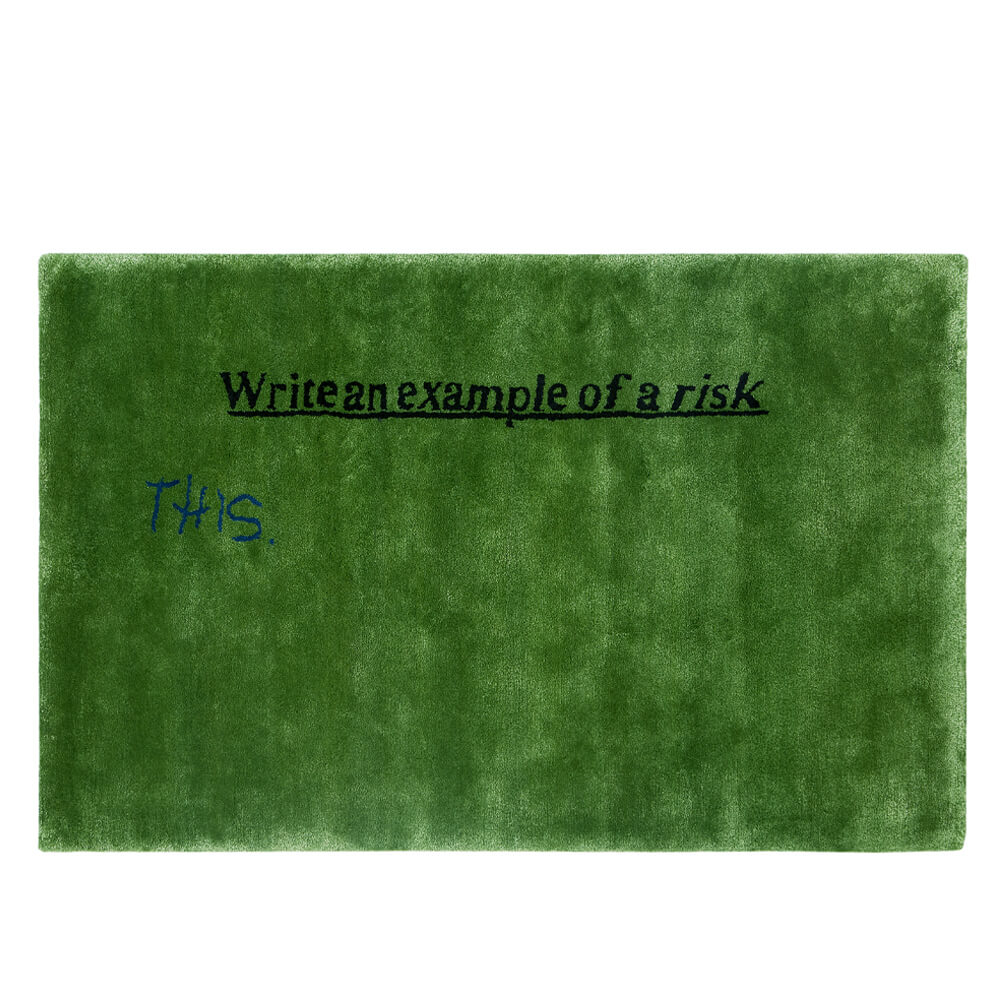 När Dan Wolgers första gången visade mig skissen till mattan ”Write an example of a risk: THIS” så kunde jag inte annat än att le. Mattan är en så kallad ready-made. Dan Wolgers har utan mellanhänder eller tillförd design tagit detta dråpliga svar på en skolfråga – en så kallad ”meme” – direkt från nätet. Han har överfört det till konst. Detta i form av en matta som under stor möda handknutits av de bästa hantverkare som finns att uppbåda i Indien.